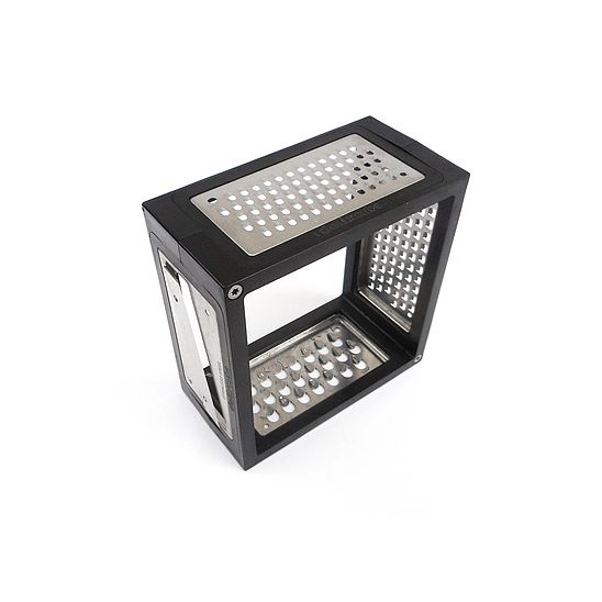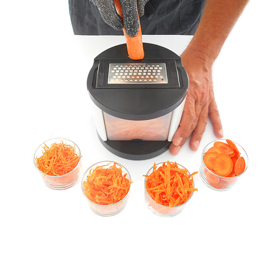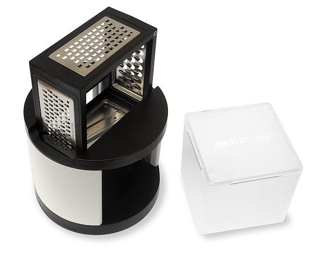 A la différence des râpes 4 faces sur le marché où l’on vient râper verticalement, l’ergonomie du delixcube® est à l’horizontale inspirée de la mandoline.